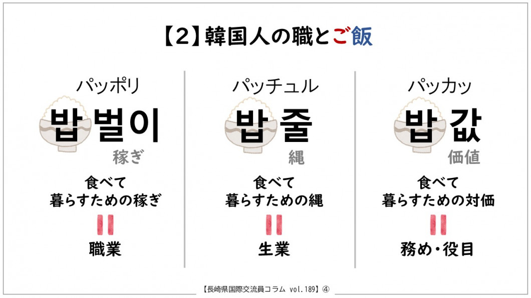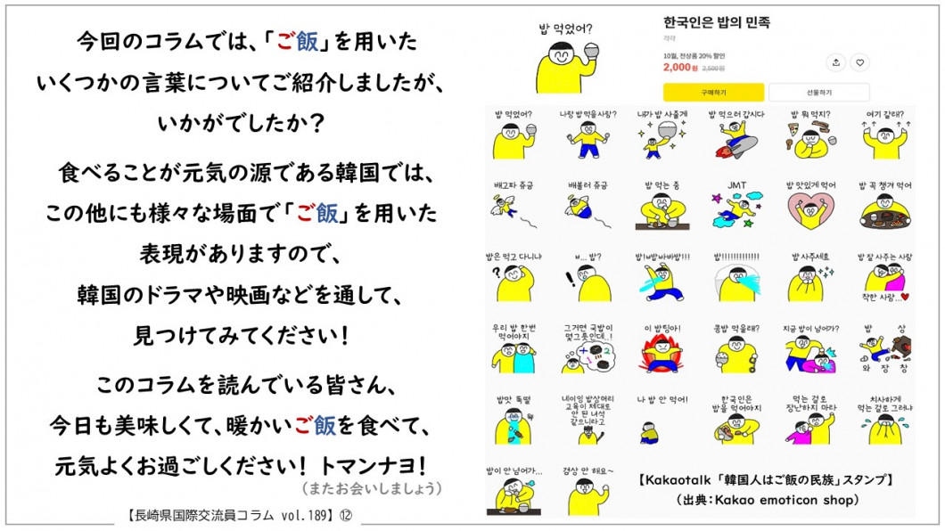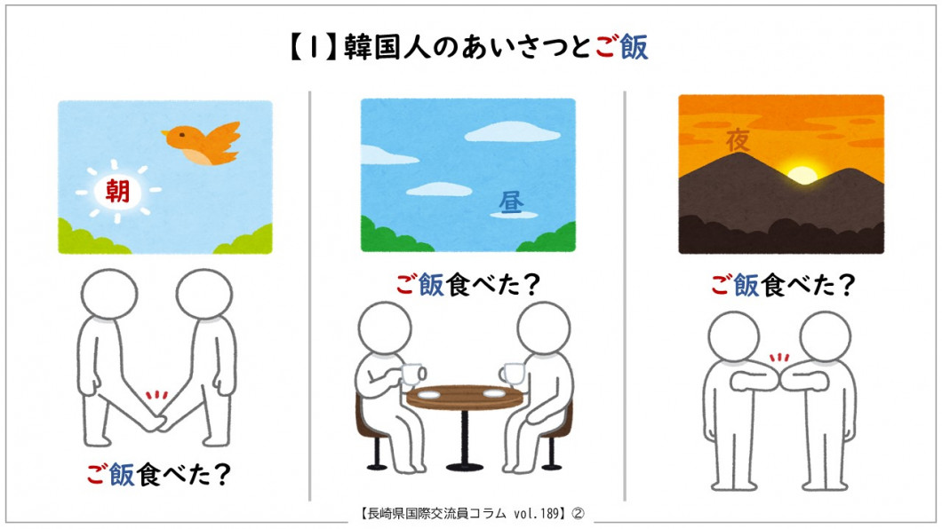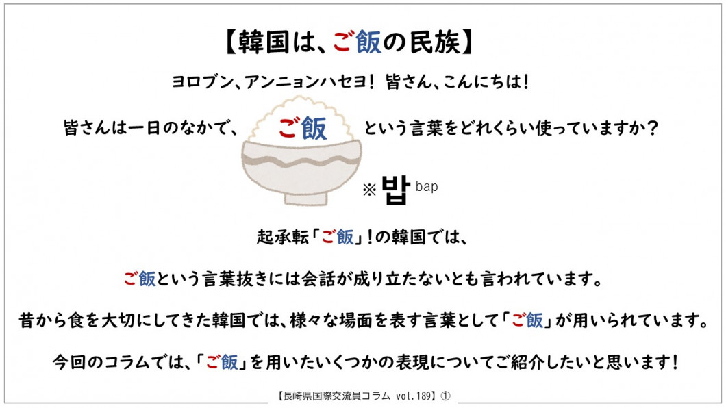 Vol.189 韓国 崔ダウン(チェ・ダウン) ※画像が見づらい場合は、下記のリンク先(PDFファイル)をご覧ください。 ⇒韓国は、ご飯の民族[PDFファイル/1MB] カテゴリー 分類 観光・教育・文化 国際交流・パスポート 国際交流 長崎県国際交流員のコラム(毎月更新) このページを見ている人はこんなページも見ています