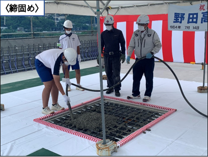 その日は、南山中学校の生徒の皆さんが現場見学を行っており、式典にも参加いただいてコンクリートの打設体験などを行っていただきました。