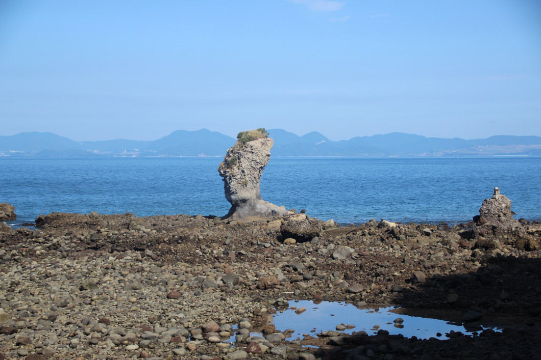約150万年前の火山活動でできた火山が、長い年月をかけて山のすそ野が波の力でけずられ、人の顔のようになった岩の塔。地域の人からは「岸信介岩」や「モアイ像」等と呼ばれ、親しまれています。