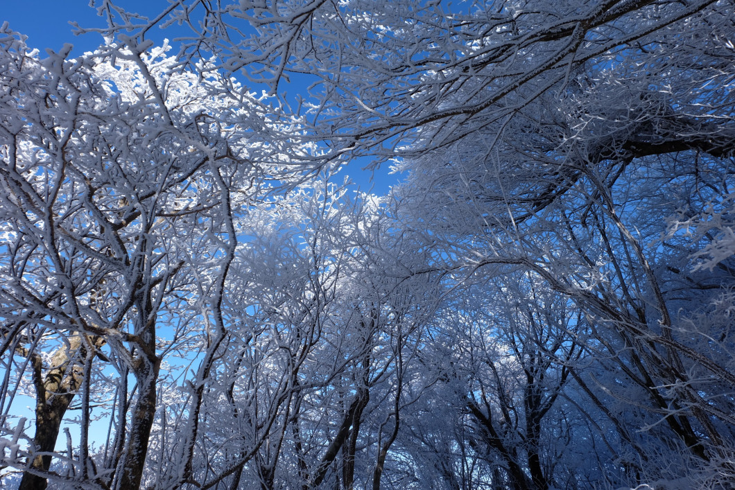 かつては普賢岳を刻む谷で、平成新山の成長により谷は一部閉塞しています。谷筋にあるこの場所は、日陰になりやすいため、気温が下がりやすく、「霧氷」(過冷却された霧粒が風で木に吹き付けられ、その刺激で氷となったもの)が見られやすいところです。