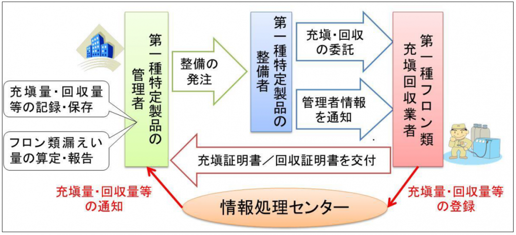 第一種フロン類充填回収業者は、第一種特定製品の整備時にフロン類の充填又は回収を行った際には、その充填又は回収を委託した整備者が整備する第一種特定製品の管理者に対して、「充填証明書」及び「回収証明書」を交付する必要があります。