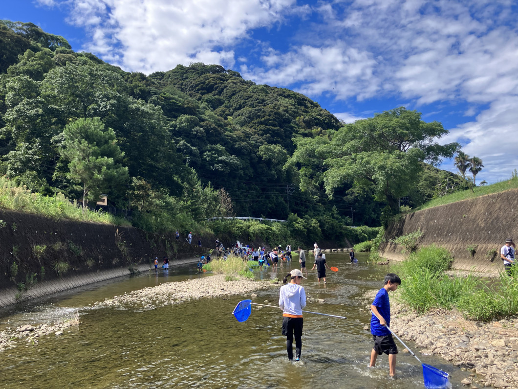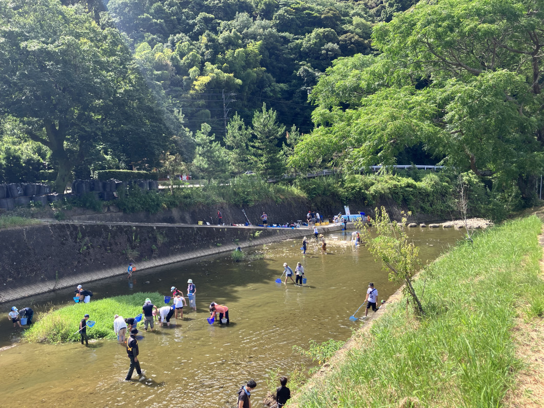 総勢約60名で生き物を採取し、採取した生き物で水質がどのくらい綺麗かを判断する目安を学習しました。