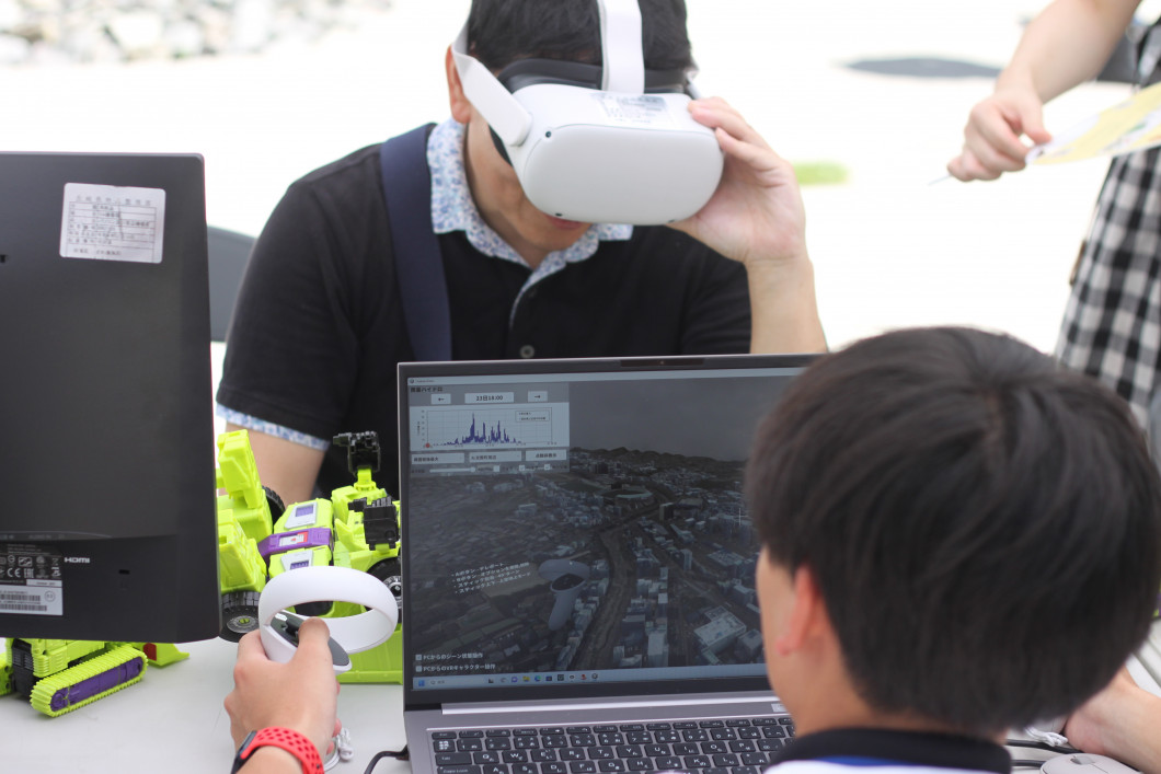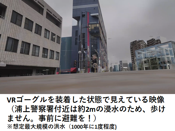 県市だけでなく、自衛隊や消防、ライフライン事業者、気象台、社会福祉協議会、防災士会等が参加するなかで、私たちはVR空間内で浦上川の流域における浸水体験ができるコーナーを担当しました。想定される最大規模の降雨(24時間雨量1040mm、長崎大水害の約2倍)で浦上川が氾濫した場合に、市街地周辺で浸水が想定される状況を体験するものです。
