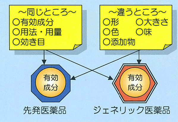 - ジェネリック医薬品は、薬の剤形や添加物(形、色、味)が先発医薬品とは変わっていることがあります。