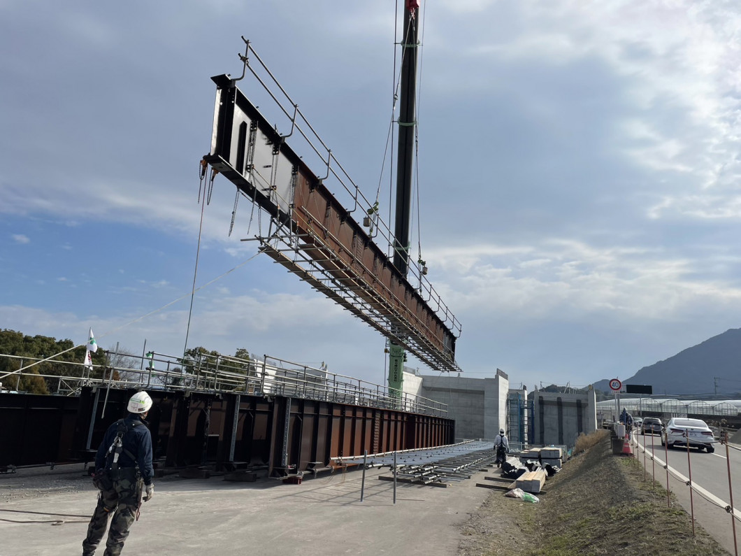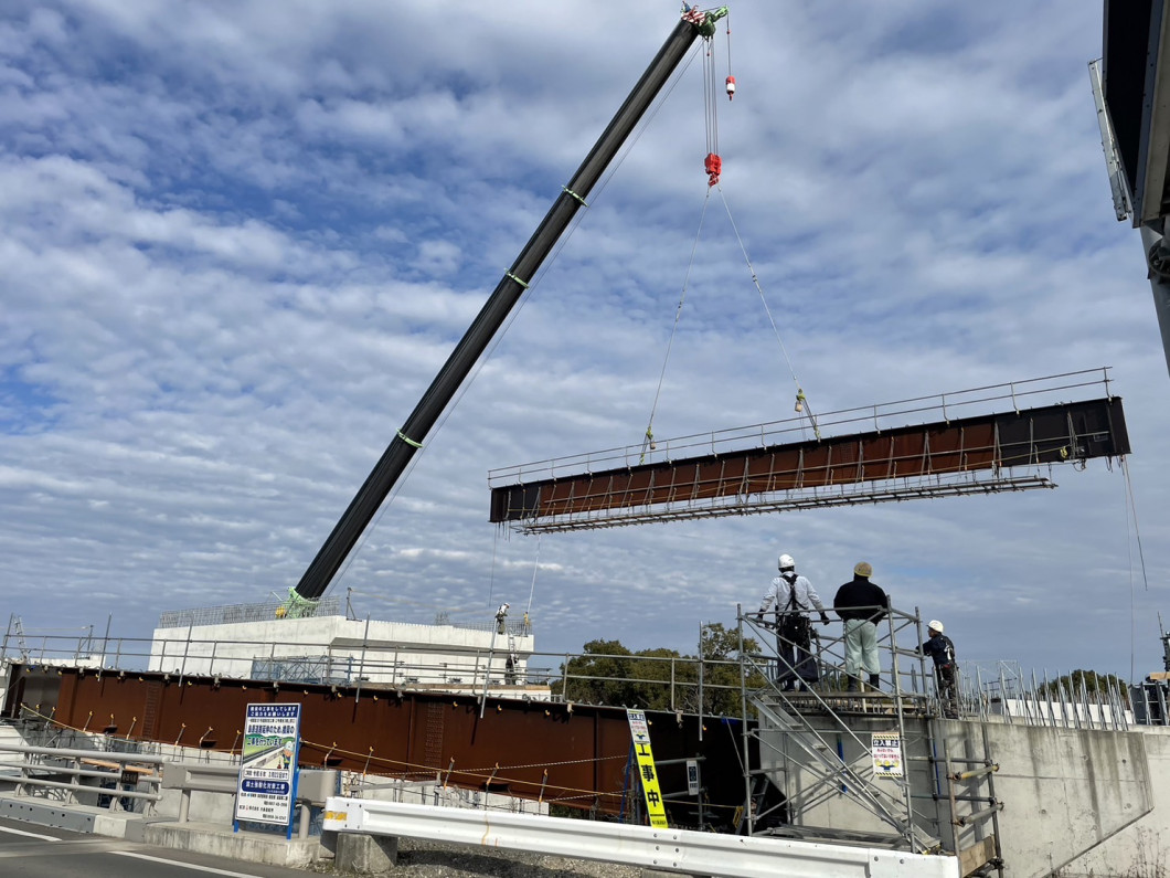 橋桁を吊り上げて架設する工法を採用しており、今回は400tクレーンを使用しています。大きなクレーンで架設する様子は大変迫力があります。