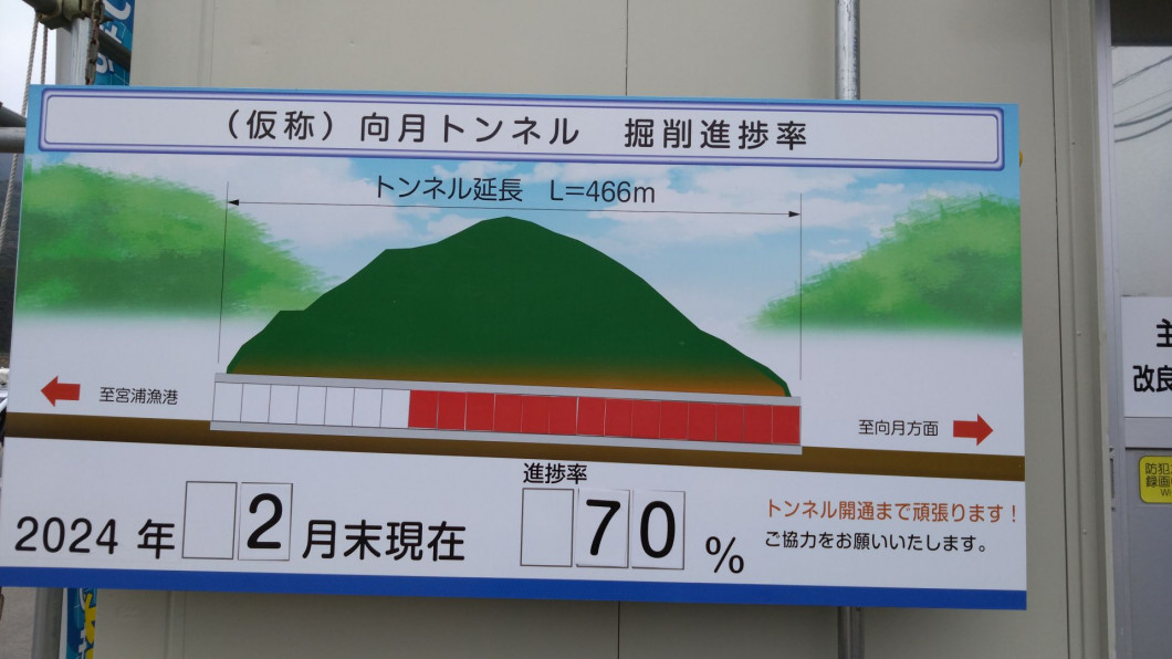 トンネル工事進捗状況 主要地方道平戸田平線(仮称)向月トンネルの工事進捗状況をお知らせいたします。 令和6年2月末時点での工事進捗状況 トンネル掘削延長:約326m(約70%) 工事進捗状況(令和6年2月末時点) 切羽の様子(令和6年2月末時点) トンネル内の様子 その1(令和6年2月末時点) トンネル内の様子 その2(令和6年2月末時点) トンネル外の様子(令和6年2月末時点)