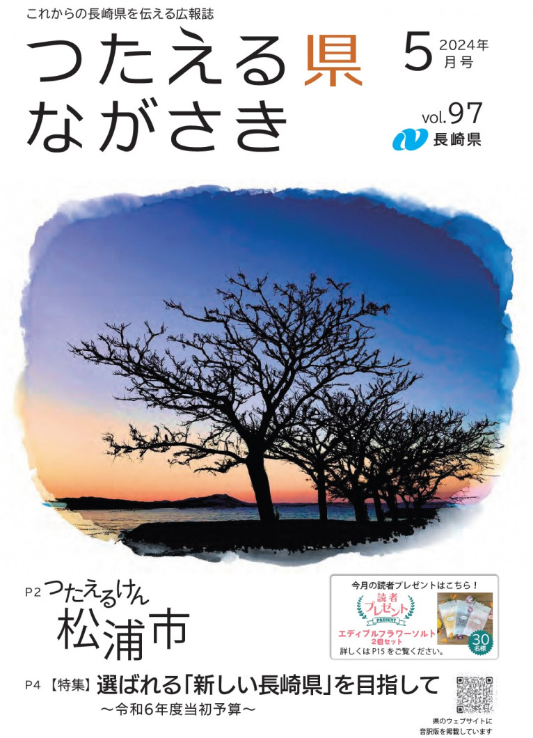 プレゼントの応募はこちらをクリック新しいウィンドウで開きます デジタルブック(電子書籍版)はこちらをクリック(外部リンク)新しいウィンドウで開きます 全ページ つたえる県ながさき5月号(16ページ)[PDFファイル/8MB] 表紙 つたえる県ながさき5月号表紙[PDFファイル/818KB] つたえるけん 松浦市 つたえる県ながさき5月号つたえるけん(2ページから3ページ)[PDFファイル/2MB] 特集 選ばれる「新しい長崎県」を目指して~令和6年度当初予算~ つたえる県ながさき5月号特集(4ページから7ページ)[PDFファイル/3MB] つたエールけん カラフルファーム株式会社 つたえる県ながさき5月号つたエールけん(8ページ)[PDFファイル/841KB] すすめるけん 長崎県職員になろう! つたえる県ながさき5月号すすめるけん(9ページ)[PDFファイル/872KB] 県政トピックス ミライ企業Nagasakiを開催! 新しくなったながさき県民の森へ遊びに行こう! つたえる県ながさき5月号県政トピックス(10ページ)[PDFファイル/608KB] ながさきレシピ、すくすくいきいき アジのマリネ 5月14~20日はギャンブル等依存症問題啓発週間です つたえる県ながさき5月号ながさきレシピ、すくすくいきいき(11ページ)[PDFファイル/784KB] 情報ひろば つたえる県ながさき5月号情報ひろば(12ページから14ページ)[PDFファイル/935KB] 読者プレゼントなど 県の広報テレビ番組「みジカなナガサキ」放送中! つたえる県ながさき5月号読者プレゼントなど(15ページ)[PDFファイル/1MB] 裏表紙 地域の特色ある文化・芸術【松浦市】 つたえる県ながさき5月号裏表紙[PDFファイル/756KB]