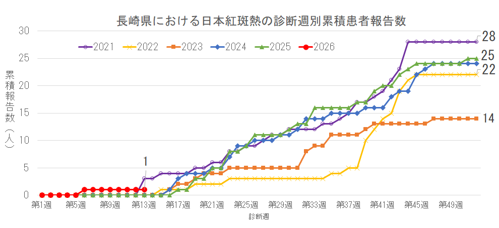長崎県は2026年第13週、全国は2026年第12週までの報告数を掲載しています。