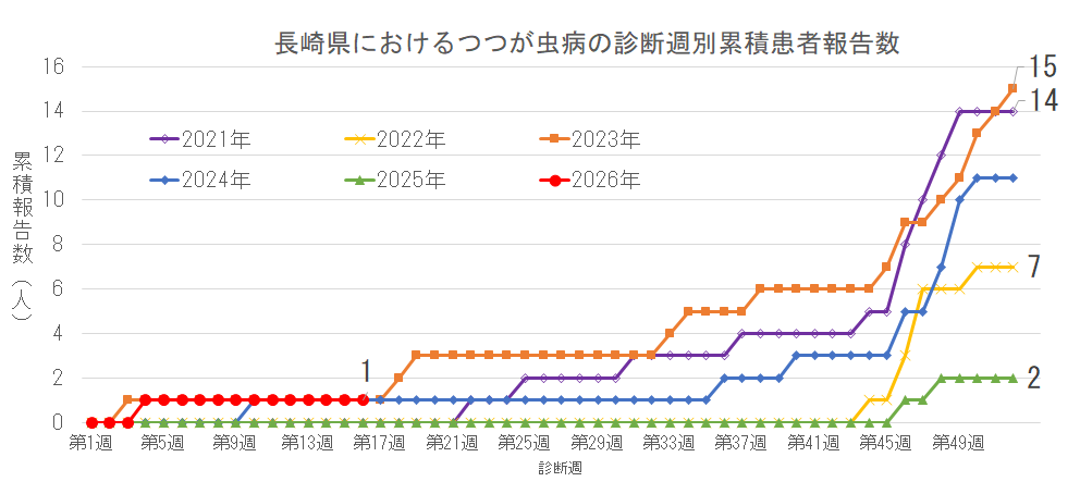 長崎県は2026年第16週、全国は2026年第15週までの報告数を掲載しています。