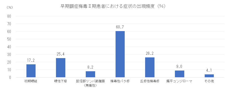 - 早期顕症梅毒1期のほとんどの患者で性器に症状がみられています。