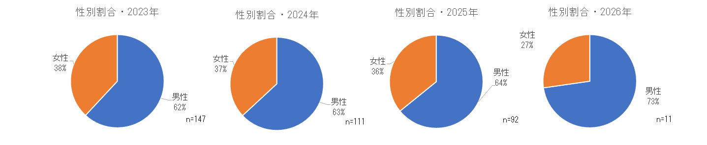 - 2023年と2024年の報告において、性別割合に大きな違いはありません。