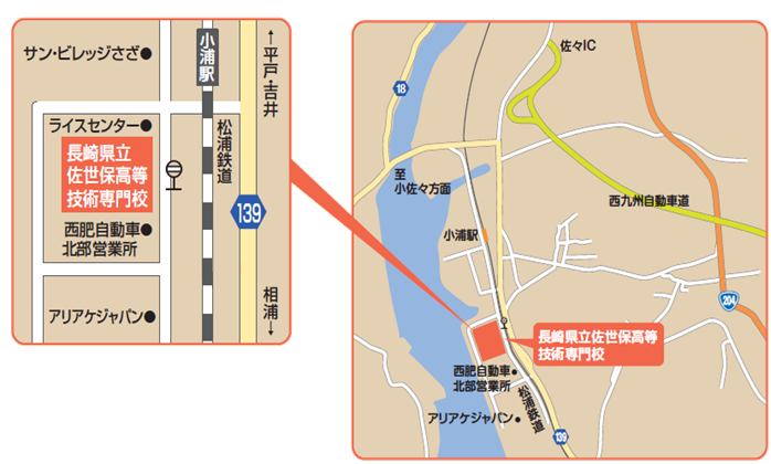 鉄道 松浦鉄道「小浦駅」下車徒歩5分 西肥バス 北部営業所行き(佐々バスセンター経由)で「佐世保高等技術専門校」下車 車 西九州自動車道「佐々インターチェンジ」を出て、左折5分 [caption id="attachment_438582" align="alignnone" width="698"] 佐世保高等技術専門校の案内図(交通アクセス地図)[/caption]