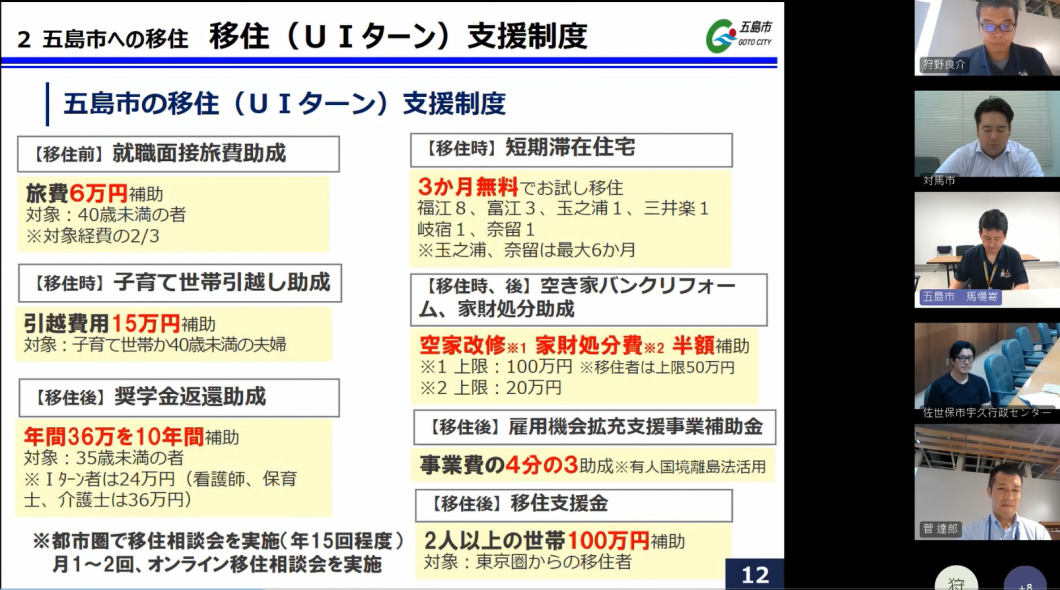 当日は、長崎県担当者から、長崎県の「しま」の概要や国境離島地域で活用できる創業・事業拡大支援制度を説明した後、対馬市、佐世保市宇久、五島市の担当者から、島の基本的な情報や、取組事例、島外から移住される方への支援制度など、島の魅力について紹介しました。