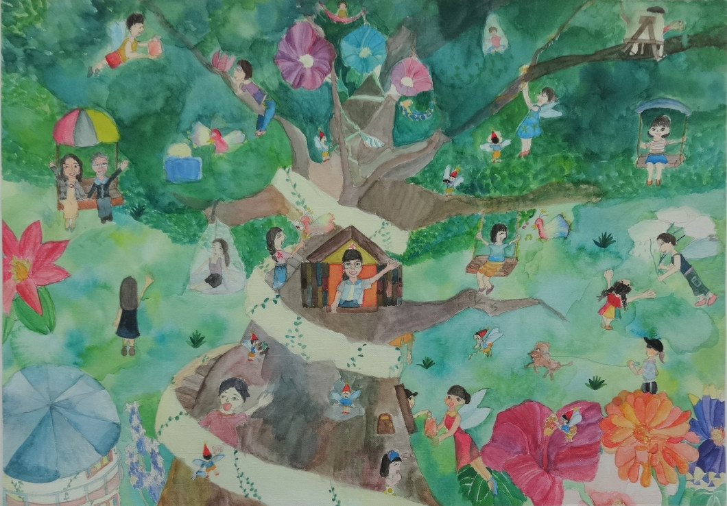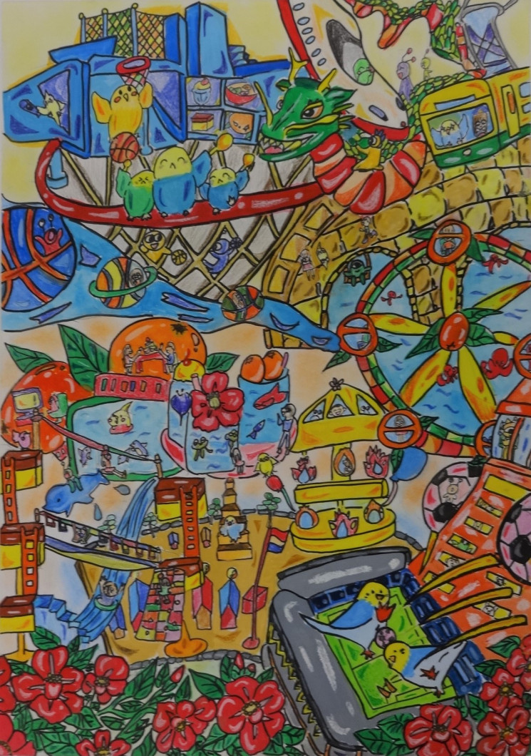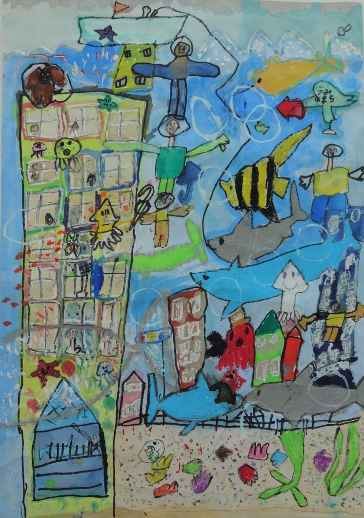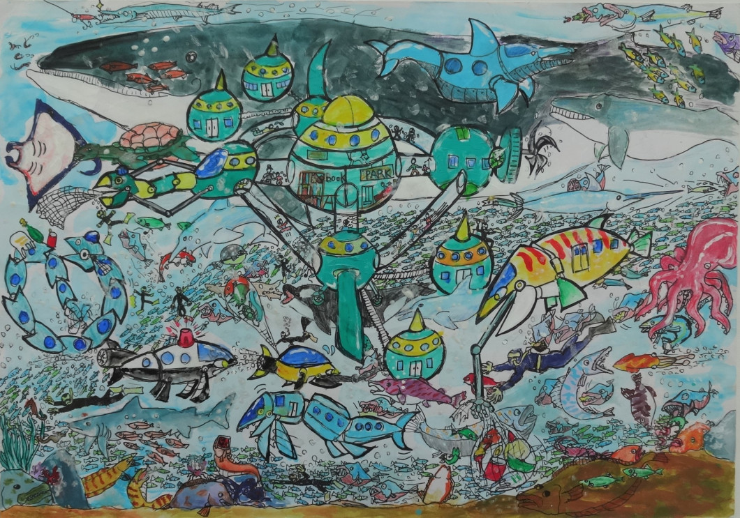 ・「魚×メカ」の組み合わせで、この2つがとにかく好きなのだろうな、と伝わってくる作品。魚の群の描きこみに圧倒される。 海の中の移動する街が海のゴミをとる役目もしているとのこと。同時にこの街が、台風の日でも対馬や五島といった離島と行き来し、人々の移動手段にもなるという、長崎県全体を視野に入れたコンセプトを評価した。 ・未来の長崎の海の中には、たくさんの多様な魚たちと技術力をいかした人々の営みが共存し、今よりもっと豊かで、人にも自然にも優しい世界が広がっているということを、すばらしい発想力、表現力で表している。作者の日ごろからの感性豊かな視点を感じさせる作品。 ・魚の大群が細かく丁寧に描かれており、水の流れが感じられる。台風時でも離島に移動できるトンネルのようなものの発想がすばらしい。 ・長崎の特徴である「海のまち」として、未来を描いており、海と共存して暮らしていく町を丁寧に表現されている。 |