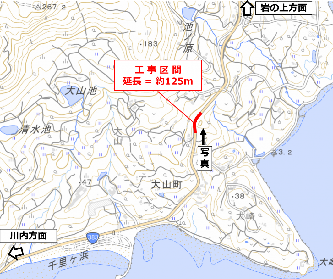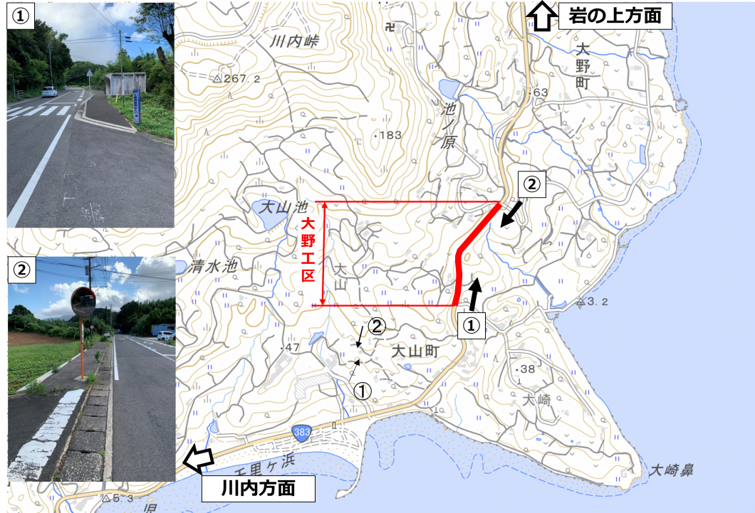一般国道383号道路改良工事(大野工区)の概要 当区間はカーブがきつい区間、歩道がない区間があります。そのため道路改良工事により、カーブを緩やかにすること、歩道を確保することを目的に事業を進めています。 工事進捗状況 令和6年10月22日にカーブ区間の舗装工事が完了しました。 工事完了区間 工事完了写真