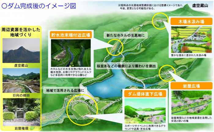 石木ダムの建設に当たっては、ホタルなどの水生生物とも触れ合えるよう親水施設やスポーツ・イベントに利用できる広場など、周辺の環境資源を活用した施設整備を行っていきます。