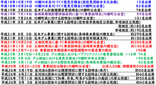 Q.石木ダム建設事業について、反対されている地域住民へ説明責任を果たすことが必要ではないでしょうか? 石木ダムについては、これまでもあらゆる機会を捉え事業の必要性について説明を行い、ご協力をお願いしてきました。具体的には、石木ダム建設に反対される団体が結成されて以降、当初はお話を全く聞いてもらえない状況でありましたが、以下の通り意見交換会や説明を行っています。 その後、事業に反対される方々が提訴した訴訟においても、事業の必要性などを認める司法判断が確定しており、県としましては、既に必要性の議論をする段階にないと考えております。しかしながら、現地にお住いの13世帯の皆様のご理解とご協力を得たうえで事業を進めることが最善との考えに変わりはなく、引き続き話し合いの機会をいただけるよう努力を続けてまいります。 昨今の全国で自然災害が頻発・激甚化している現状を踏まえても、石木ダムは必要不可欠な事業であり、県民の安全・安心を確保することは行政の重要な責務であります。県民の皆様にご理解をいただきながら事業を進めることは、非常に大切なことであると認識しており、今後も、県民の皆様方のご理解が深まりますよう、内容や方法に工夫をこらしながら、分かりやすい広報に努めてまいりたいと考えております。