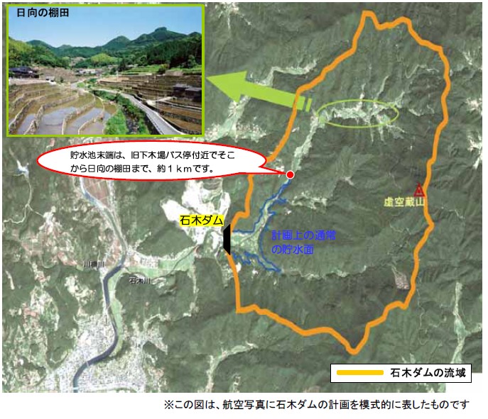 日向の棚田の場所は、石木ダム貯水池よりも上流に位置しますので、影響することはありません。