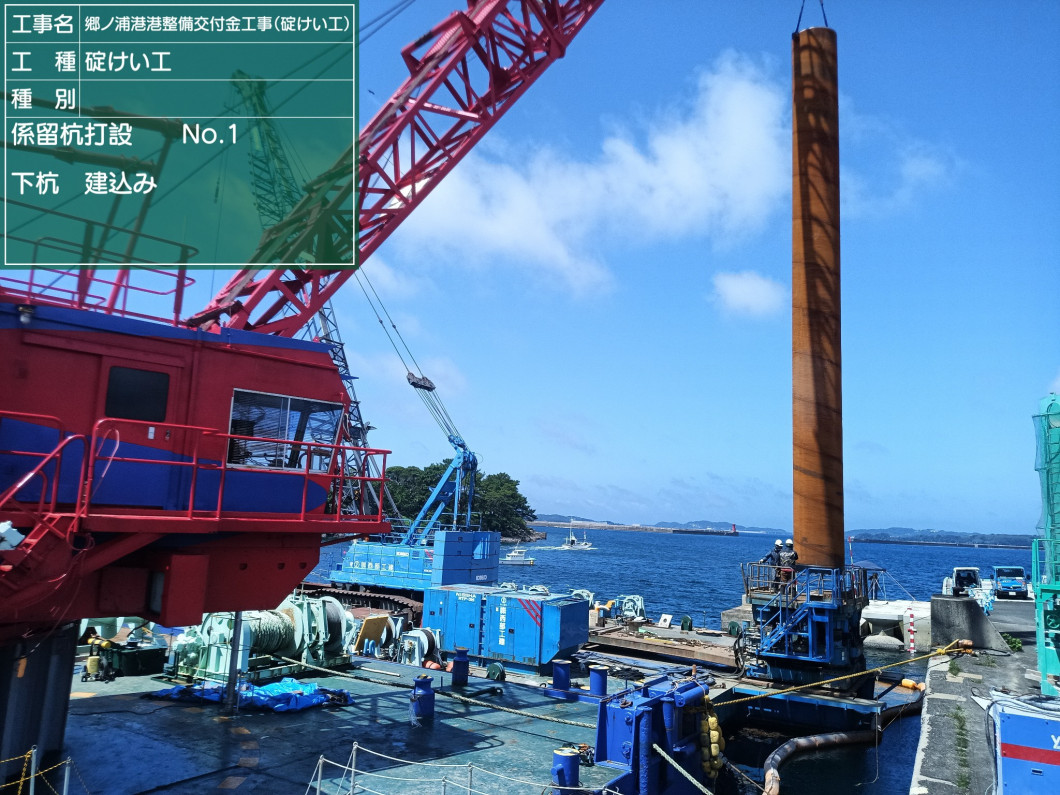 今回の杭は直径がφ1500mmと、県内浮桟橋の係留杭の中でも最大級の杭になるのですが、オールケーシング掘削機という専用の杭打機を使用して無事に完了することができました。