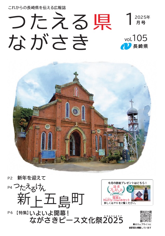 プレゼントの応募はこちらをクリック デジタルブック(電子書籍版)はこちらをクリック(外部リンク)新しいウィンドウで開きます 全ページ つたえる県ながさき1月号(16ページ)[PDFファイル/7MB] 表紙 つたえる県ながさき1月号表紙[PDFファイル/850KB] 新年を迎えて つたえる県ながさき1月号新年を迎えて(2ページから3ページ)[PDFファイル/2MB] つたえるけん 新上五島町 つたえる県ながさき1月号つたえるけん(4ページから5ページ)[PDFファイル/2MB] 特集 いよいよ開幕!ながさきピース文化祭2025 つたえる県ながさき1月号特集(6ページから9ページ)[PDFファイル/3MB] 令和六年県民表彰 つたえる県ながさき1月号令和六年県民表彰(10ページから11ページ)[PDFファイル/1MB] 情報ひろば つたえる県ながさき1月号情報ひろば(12ページから13ページ)[PDFファイル/510KB] ながさきレシピ、すくすくいきいき かんころ餅のグラタン 「はたちの献血」キャンペーン つたえる県ながさき1月号ながさきレシピ、すくすくいきいき(14ページ)[PDFファイル/624KB] 読者プレゼントなど 「長崎県総合計画」・「長崎県まち・ひと・しごと創生総合戦略」の策定に向けたアンケート調査を実施します! つたえる県ながさき1月号読者プレゼントなど(15ページ)[PDFファイル/1MB] 裏表紙 地域の特色ある文化・芸術【新上五島町】 つたえる県ながさき1月号裏表紙[PDFファイル/938KB]