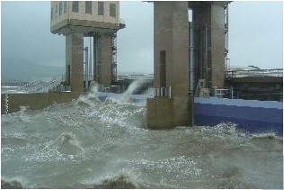 台風時の潮受堤防(北部排水門、写真は平成16年台風16号のとき)[/caption]