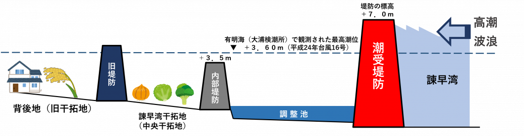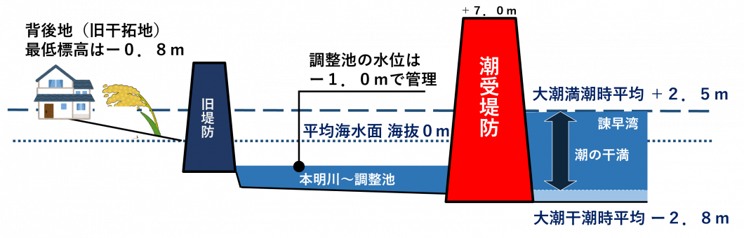 諫早湾干拓事業では、北側の諫早市高来町と南側の雲仙市吾妻町とを結ぶ潮受堤防で諫早湾を締め切って、潮受堤防と調整池を設置し、背後地における高潮被害と洪水被害を防止する防災機能を有しています。