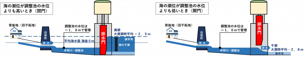 調整池は、潮受堤防にある排水門を通常は締め切り、干潮のときに排水門を開けて排水することで水位を管理します。