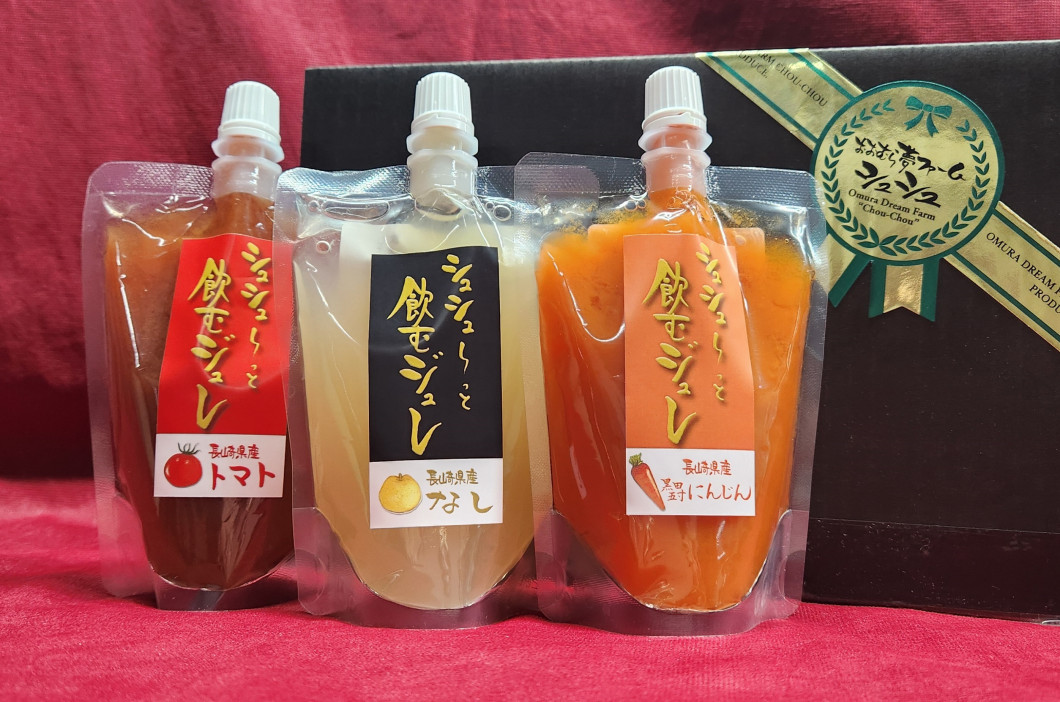 「長崎四季畑」の認証商品。県産の野菜や果物を使用した濃厚で味わいのあるジュレです。今回は、黒田五寸人参、梨、トマトの3個セットをお届けします。ぜひご賞味ください。