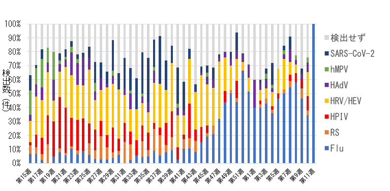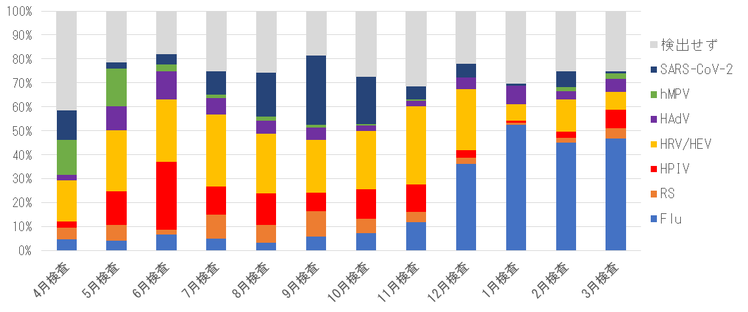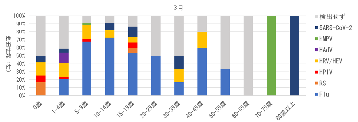 - 3月に搬入された検体において、インフルエンザウイルスが幅広い年代で検出されました。1~4歳では、SARS-CoV-2を除くすべてのウイルス遺伝子が検出されました。
