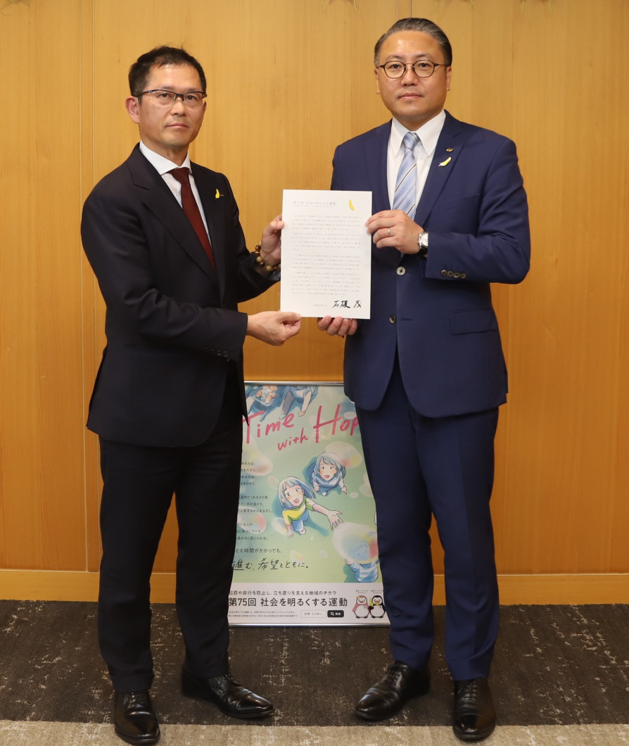 大石知事に「内閣総理大臣メッセージ」と「幸福(しあわせ)の黄色い羽根」が届けられました