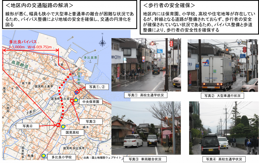一般国道389号(多比良バイパス)は、歩行者と車両の安全・安心な交通の確保及び、雲仙方面へのアクセス強化を目的に、平成22年度より事業に着手しております。