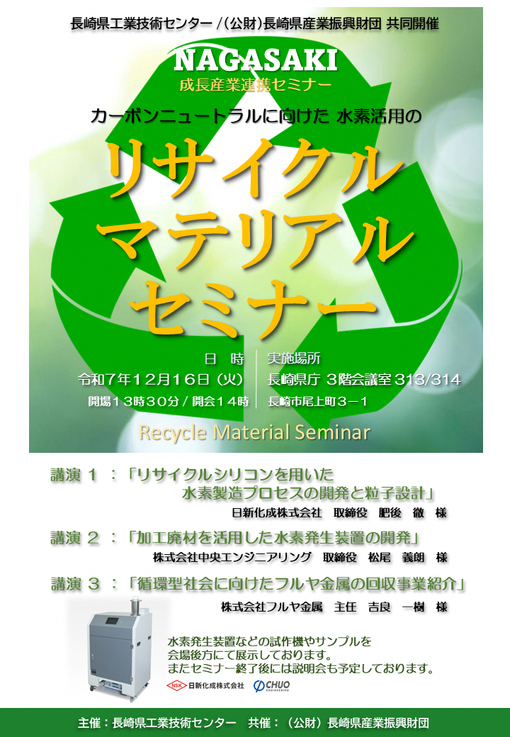 県内企業への情報提供と新規参入支援を目的として、長崎県産業振興財団との共催により「カーボンニュートラルに向けた水素活用のリサイクルマテリアルセミナー」を開催いたします。本セミナーでは、リサイクルマテリアル技術に携わる3名の講師をお招きし、産業廃棄物を活用した「加工技術」「エネルギー生成技術」「レアメタル回収技術」について、ご紹介いただきます。再生可能エネルギー(水素を含む)の活用や、循環型社会の実現に向けた事業のヒントを得られる機会ですので、ぜひご参加ください。