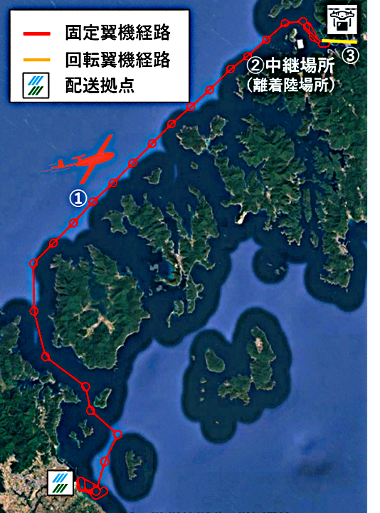 - 固定翼機にて、新上五島町青方で運用中の投下場所まで配送