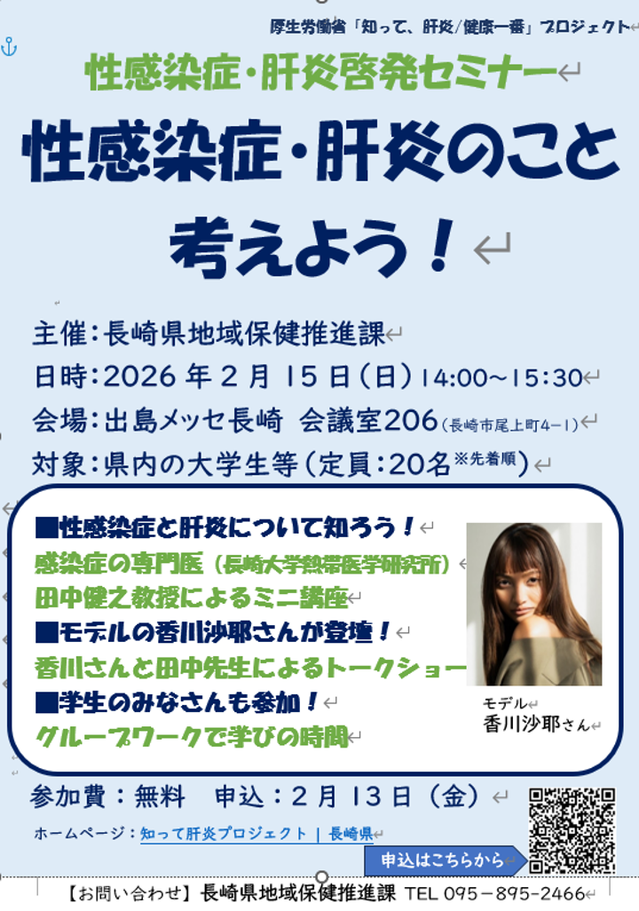 2026年2月15日(日)出島メッセにて、県内大学・専門学校等の学生を対象に、肝炎や性感染症に関するセミナーを開催します。