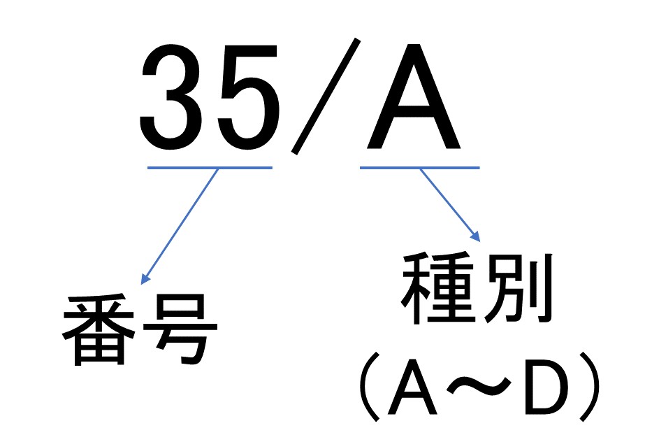 各道路には、上のような番号および記号が記載されています。ここには「/」(スラッシュ)または「-」(ハイフン)を挟んで、道路の番号と道路の種別が記載されています。道路の種別の説明は、以下のとおりです。