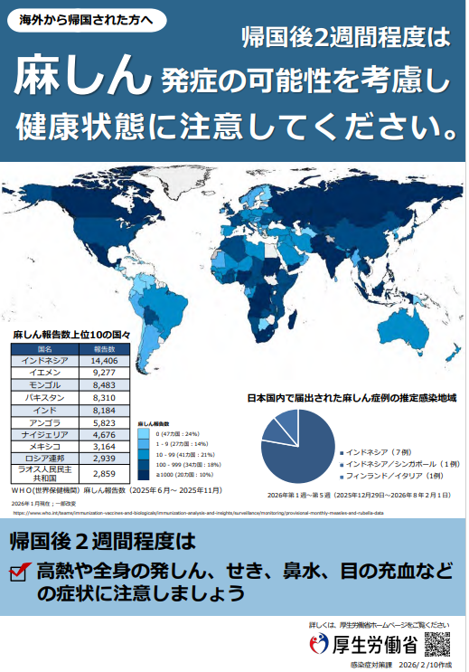 - 渡航後や帰国後2週間程度は麻しん発症の可能性を考慮して、健康状態に注意すること。