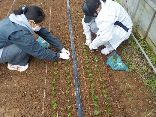 1年生とともに、8月出荷用のキク直挿しをしました。輪ギクは県オリジナル品種の「白涼」も植えました。学生たちにとっては初めての直挿しです。