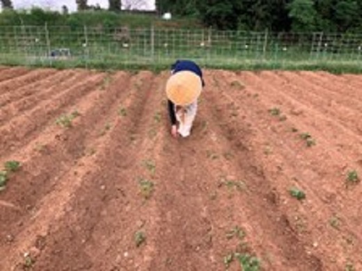 9月8~9日に種いもの植付けを行い、翌9月10日すぐにイノシシ対策でWM柵も設置しました。現在、早い品種が出芽し始めております。いもの腐敗対策で、かん水での下温による腐敗発生の違いについてプロジェクトに取り組んでいますが、かん水した分雑草も生え、除草作業も頑張っています(園芸学科野菜コース学生)
