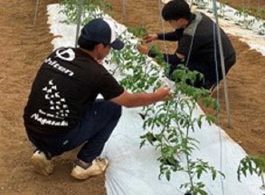 暑い中、無事接ぎ木作業や育苗を終え、9月16日にガラス温室に大玉トマト「かれん」・中玉トマト「シンディーオレンジ」の定植、支柱立て・誘引作業を9月25~26日に行いました。
