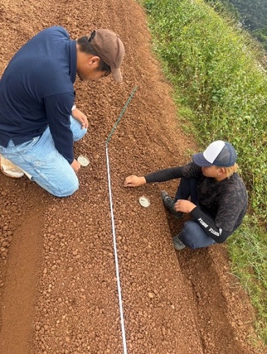 今回は中生種「アンサー」の直播に挑戦します。マルチ被覆は行わず、播溝を深めに作ってしっかりと水分保持ができるように被覆資材をかけて管理しています。発芽もまずまずです。