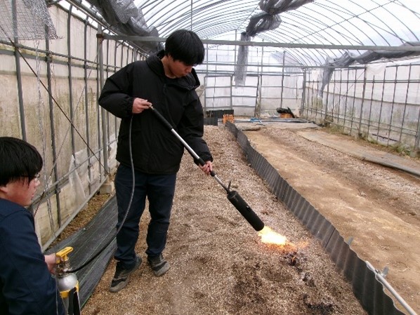 アスパラガス栽培におけるこの時期ならではの作業を行いました、まずは、畦の上をバーナーで焼く作業です。 これは、圃場の上の雑草の種子や害虫の卵、病原菌などを削減させるための重要な作業です。