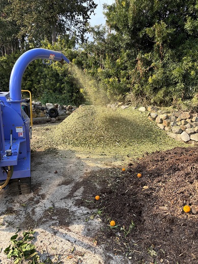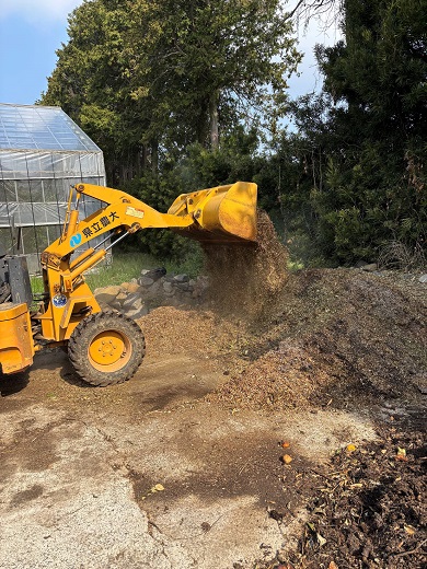 冬にせん定した枝を細かく粉砕し、腐敗果実をつぶしてものを混ぜ合わせたのもでたい肥を作っています。1年経ったものを10月8日にびわ園に施用しました。