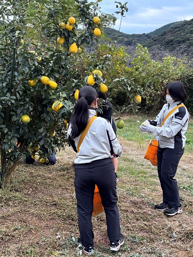 諫早農業高校の食品化学科の学生3名が加工に使用するレモンの収穫を本校で行いました。