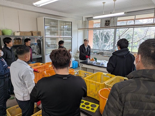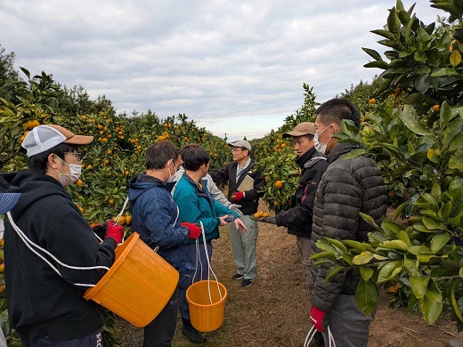 農福連携技術支援者育成研修が本校を会場に行われました。ミカンの収穫、調整作業について果樹コースの原口早生の圃場で行ない収穫時の注意点を説明しました。 室内に戻り、大きさの選別、袋づめ作業等を実施しました。今回の受講者は福祉事業所で指導される人たちで、今後、農福連携を実際行う上での問題点を把握して活動が広がっていくことを願っています。(園芸学科果樹コース職員)