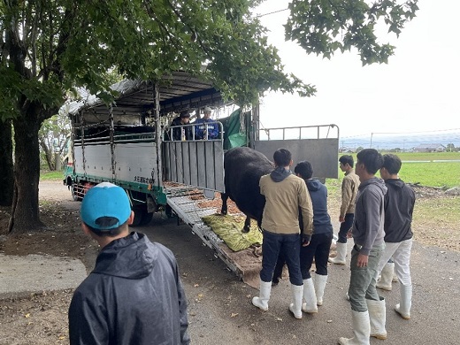 2年生板山君、山口君がプロジェクトとして取り組んだ肥育牛(去勢)5頭を、本日午後、佐世保食肉センターに出荷しました。この肥育牛は生後約26カ月齢出荷の早期肥育で、平均出荷体重は774kgでした。