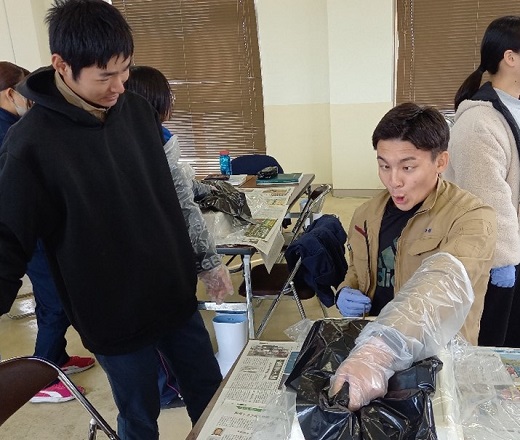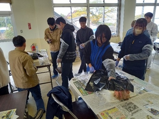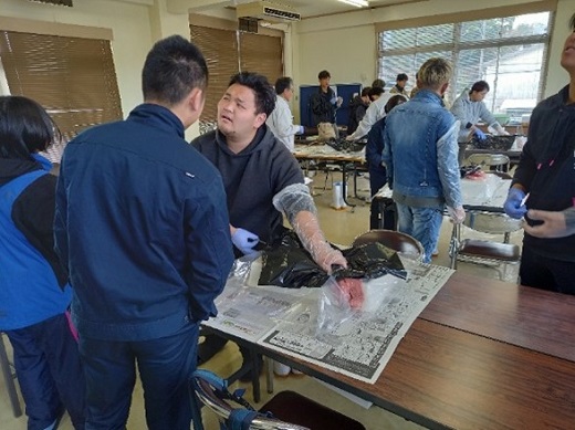 学生は家畜人工授精講習会の真っただ中で、この日は人工授精に使用する器具の準備の仕方や、解剖した子宮の子宮頚管へ精液注入器を通す練習をしました。