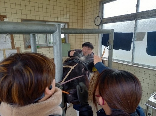 学生は、牛に長い間苦痛を感じさせないように、牛を思いやりながら、テキパキと作業を行いました!(畜産学科職員)