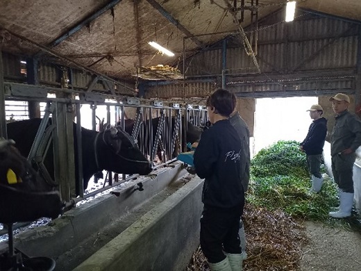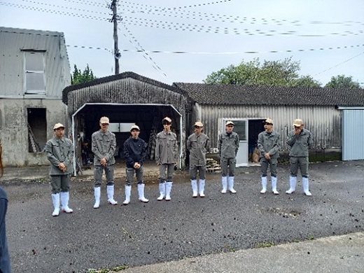 新1年生が畜産学科農場で初実習を行いました。1年生は緊張した面持ちでしたが、2年生もどのように1年生と接しようかと最初は少し緊張した様子が覗えました。