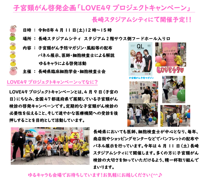 子宮頸がん予防を学ぶ啓発イベントを長崎スタジアムシティで開催します。ゆるキャラも登場!お気軽にお立ち寄りください。