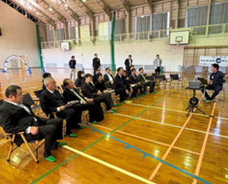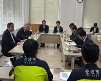 ・ 事故が発生した場合は必要な防護措置を行う。事故発生後は情報を入手し、壱岐市ではあらゆる方法で情報発信を行う。 玄海原子力発電所から半径30km圏内の住民が、最終的には30km圏外への避難が可能となるよう避難場所を確保し、収容する。 (4)壱岐市内避難所施設数は29箇所存在。UPZ圏内の人口は約13,100人に対し、収容可能人数は約16,600人であり、約3000人程の余裕はあるが、収容できない可能性があるので、避難所の新設が求められる。 ![]() 原島地区放射線防護対策施設の視察状況 ![]() 壱岐市役所調査状況 ![]() 壱岐市役所調査状況 3.一般社団法人マリンハビタット壱岐ドローンの利活用について調査を行った。